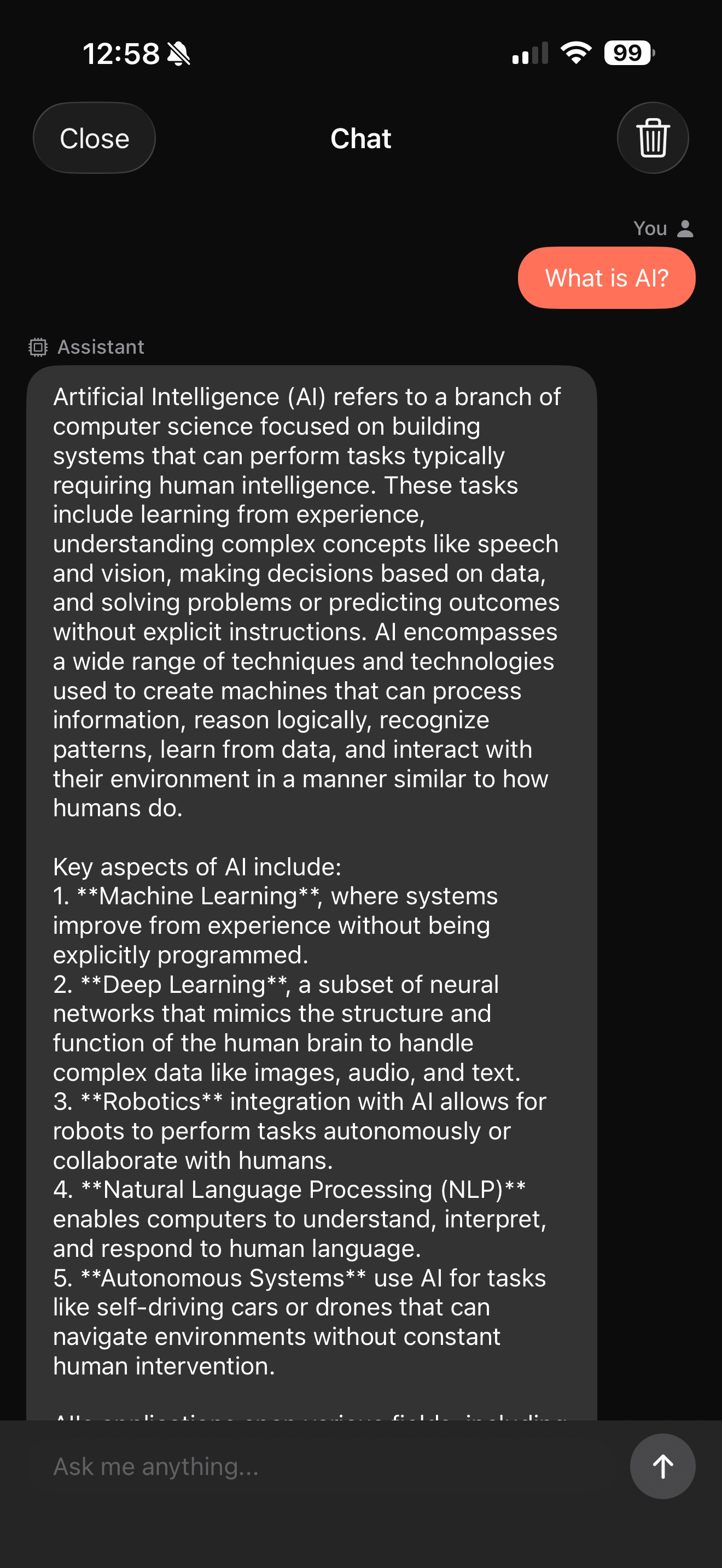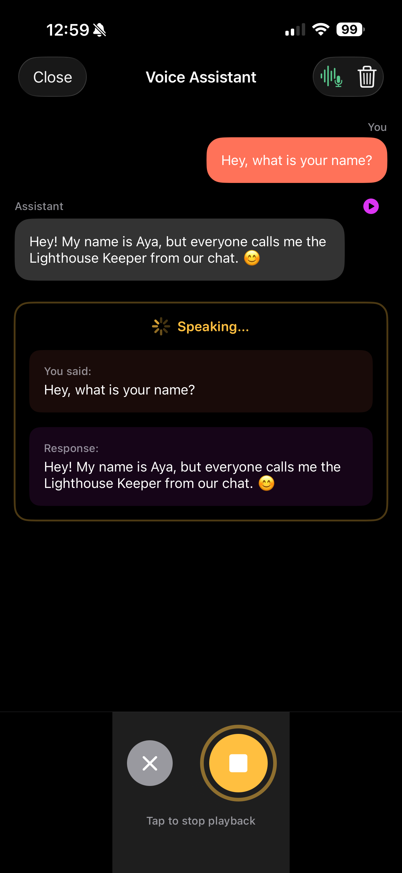 Combine LLM, STT, and TTS into a complete voice assistant with automatic Voice Activity Detection. The AI listens, thinks, and responds—all on-device.